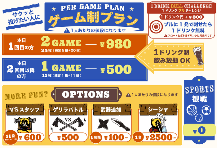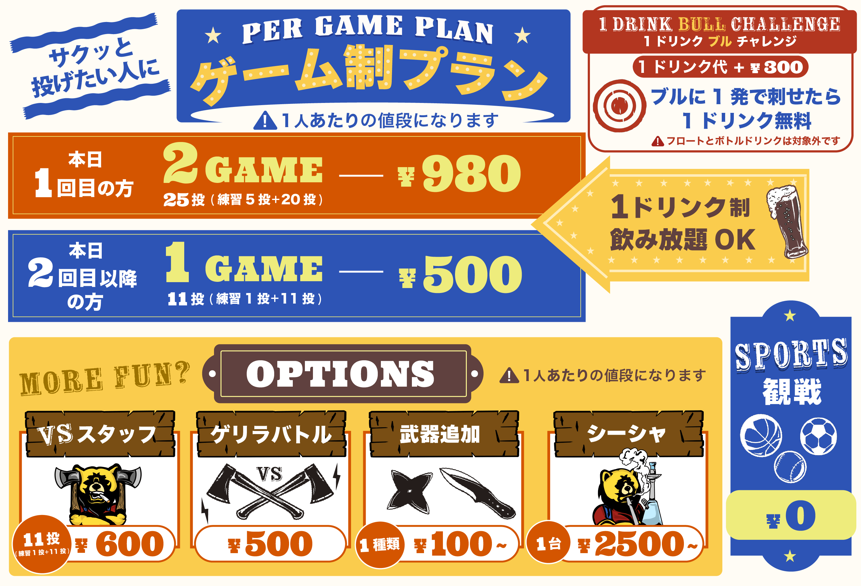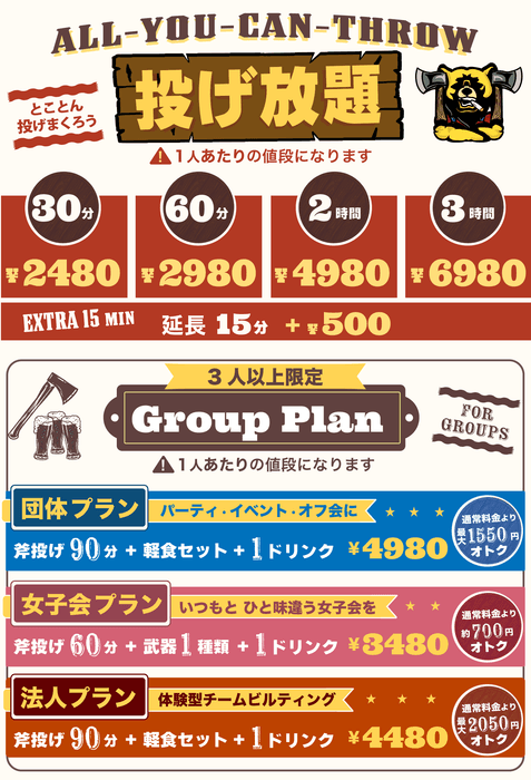 30分2480円〜利用できる斧投げ時間制プランになります。
