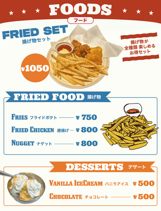 ・フライドポテトやナゲットなど、お酒と相性抜群のメニュー