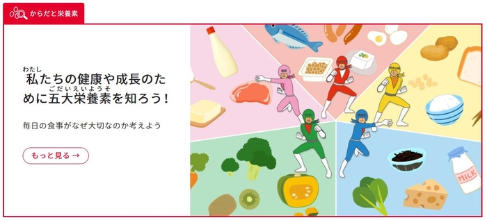 新コンテンツは、その五大栄養素をバランスよく摂取するための「6つの基礎食品群」をテーマにしています。小学校高学年から中学生の成長期は、体が大きくなるとともに活動も盛んになる時期です。同時に体型を意識しはじめる時期でもあります。極端なダイエットをして栄養が不足すると、体調不良や肌荒れにつながります。成長期という大切な時期だからこそ、さまざまな食品を上手に組み合わせ、栄養バランスのとれた食習慣を身につけて、健康な食生活を送れる大人になってほしいと期待しています。