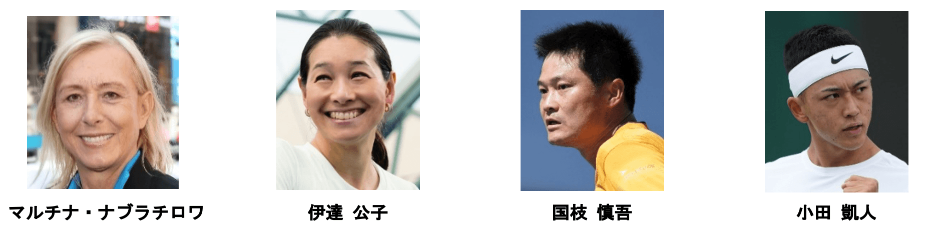 エキシビションマッチには、元世界ランキング1位、グランドスラム通算18勝、ウィンブルドンでは史上最多の9勝を挙げたマルチナ・ナブラチロワ。全豪、全仏、全英でベスト4に入るなど世界のトップで活躍し、現在はテニス解説やジュニア育成などで活躍する伊達公子。2022年に悲願の生涯ゴールデンスラムの偉業を達成、世界ランキング1位のまま、今年現役引退を表明し、3月に国民栄誉賞を受賞した国枝慎吾。今年6月に17歳1ヵ月で車いすテニスのグランドスラム優勝&史上最年少で世界ランキング1位の快挙を達成した小田凱人の4名が登場します。