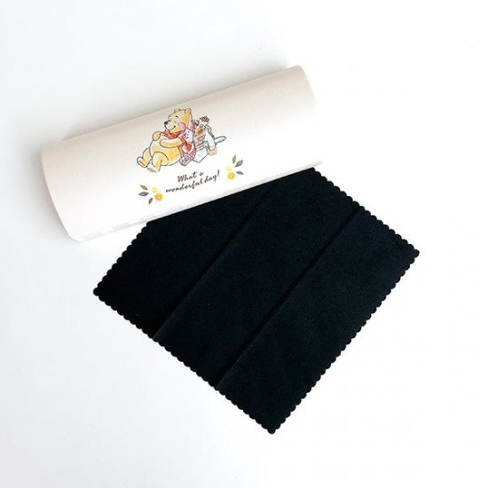 ホワイト×ベージュのギンガムチェックの背景に、プーさんとピグレットがピクニックを楽しんでいるほっこりデザインです。小花もデザインされていて、水彩画のような淡いトーンがガーリーな雰囲気。