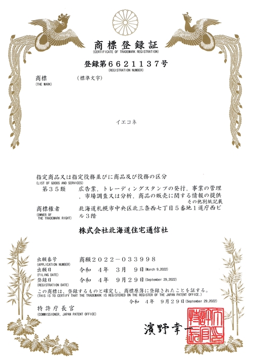 住宅業界紙「北海道住宅通信」を発行する北海道住宅通信社(本社:北海道札幌市)は自社で運営する自宅モデルハウス見学サービス「イエコネ」の商標を特許庁に出願し、登録が認められましたのでお知らせいたします。