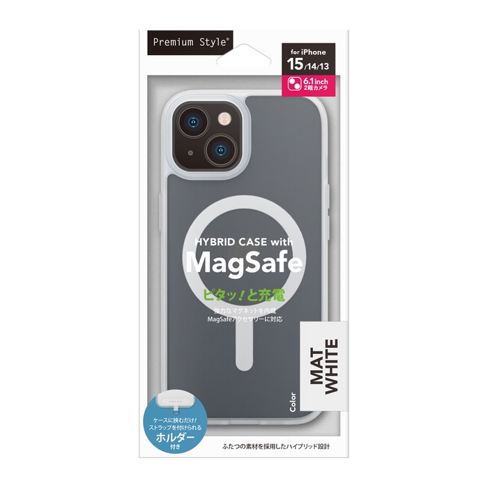 各種MagSafeアクセサリーに対応したiPhone 15/14/13用 ハイブリッドケースです。マグネットリング搭載でMagSafeアクセサリーをピタッと簡単装着。耐久性のあるポリカーボネイトとしなやかなTPUを組み合わせたハイブリッド設計で端末本体をしっかり保護します。ケース背面は半透明・側面はマットな質感で手触りも良く落ち着いたデザインです。ショルダーストラップの取り付けに便利な「ストラップホルダー」付属。