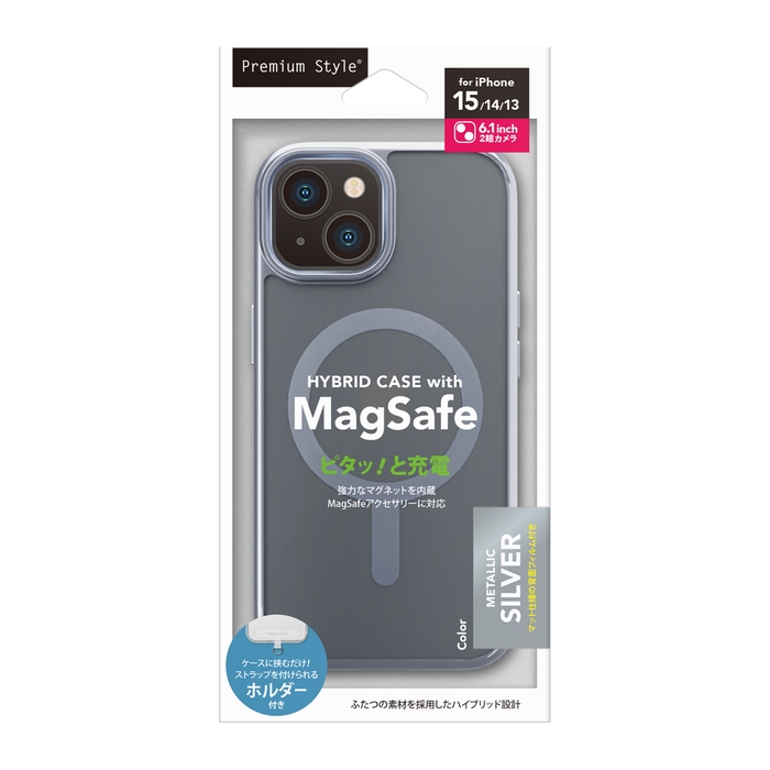 各種MagSafeアクセサリーに対応したiPhone 15/14/13用 ハイブリッドケースです。マグネットリング搭載でMagSafeアクセサリーをピタッと簡単装着。耐久性のあるポリカーボネイトとしなやかなTPUを組み合わせたハイブリッド設計で端末本体をしっかり保護します。背面はiPhone本体の美しさを活かすクリアデザイン。側面はメタリック加工された高級感のあるデザインです。ショルダーストラップの取り付けに便利な「ストラップホルダー」と、ちょっとしたイメージチェンジが可能なマット仕様の「背面フィルム」付属。