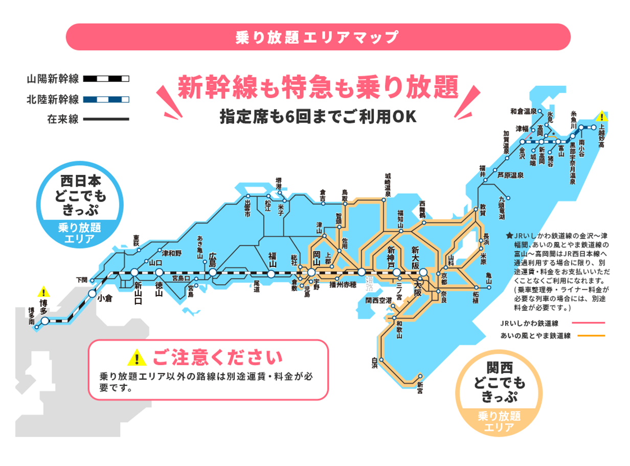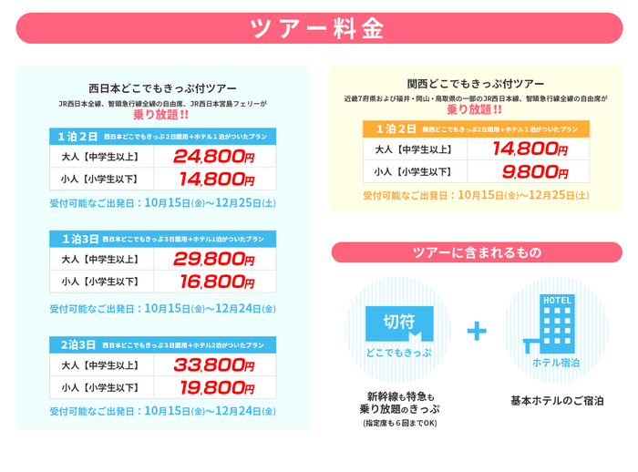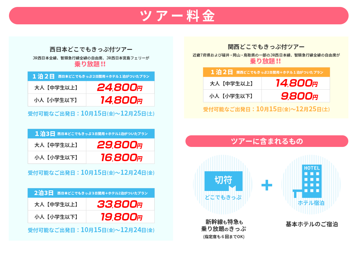 どこでもきっぷとホテル宿泊がセットになったツアーです。 JR西日本の新幹線・特急・普通列車が乗り放題!