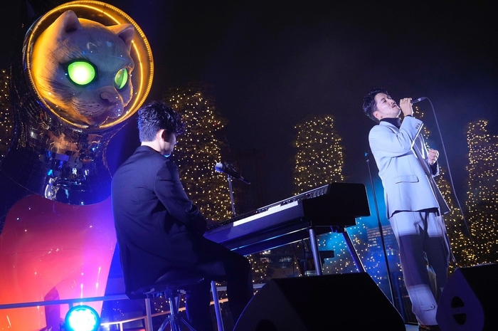 続いては、11月13日(水)におよそ2年ぶりとなるニューアルバム『Shades of』をリリースしたWONK から長塚健斗と江﨑文武が登場し、冬の夜をオシャレに彩るナンバー「Fleeting Fantasy」を演奏。ボーカルとキーボードというシンプルな構成ながら豊かなハーモニーを生み出す二人のセッションに観客もうっとり聞き入っていた。MCでは息のあった掛け合いで笑わせたり、江﨑が演奏する「ムーンリバー」に合わせて長塚が即興で歌ったりと、和やかな雰囲気で楽しませる。また、発売したばかりのアルバムから、久保田利伸が参加した「Life Like This」やBilalと共に制作した「Miracle Mantra」といった楽曲も披露。11周年を迎え、ますますの進化を感じさせるステージを見せてくれた。