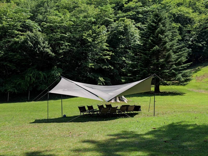 NEMOSの特筆すべき特徴の一つが、付属する「庇シート」です。メインタープの四辺に取り付け可能な「庇シート」により、自由自在な日陰の調整が可能。ソロキャンプではプライベート空間を確保する為の目隠しシートにもなりますし、ファミリーキャンプでは大人数をカバーできるシェードとしても機能します。さらに、「庇シート」は単独でタープとしても利用でき、設営の自由度が無限大に広がります。