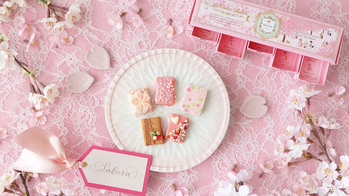 中央のラスクには、桜を模したチョコレート。銀箔シュガーがキラキラと光を添えています。中央右のラスクには弾けるキャンディチョコレートを使用。ストロベリー味のチョコレートの中にパチパチと弾けるキャンディが入っており、甘酸っぱいくちどけの中でアクセントに。左側、キャラメルチョコレートのラスクには、ストロベリーやピスタチオと一緒に金色の金平糖をトッピング。この3種は桜のフレーバーを使用しており、口にするとほんのり桜の香りが広がります。
