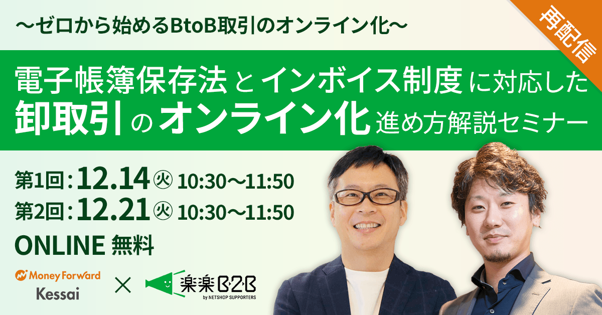 【12/14・21オンライン開催】~ゼロから始めるBtoB取引のオンライン化~ 「電子帳簿保存法」と「インボイス制度」に対応した卸取引のオンライン化進め方解説セミナー