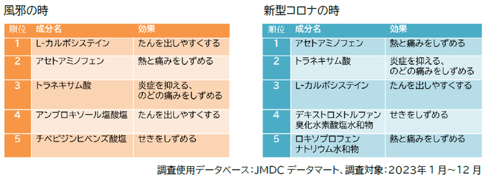 このように、風邪と新型コロナでは病院で処方される薬の成分は少し異なりますが、薬の効果の種類には大きな違いがないことが分かりました。また、15歳以上で集計した場合は、新型コロナと風邪で処方される薬の上位5種類は同じ成分※2が占めていました。