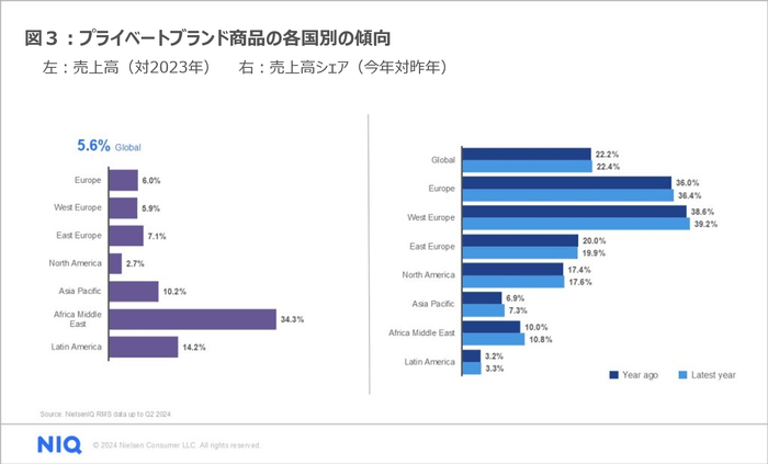 2025年に向けて、世界の消費者の消費活動は改善の兆しを見せているが、各国でのインフレの影響により、消費者の購買における商品・サービスへの吟味の目は厳しくなっている。その結果、購買客は自分が支払う金額に見合うと思われる商品の特性を見極めた上で、より意図的に消費するようになると想定される。今回発表の販売データの推移は、消費者がプライベートブランド商品に独自の価値を見出して購入していることを証明している(図3)。2024年第2四半期のNIQ RMSのデータによると、プライベートブランドは世界における12ヶ月間で+5.6%の金額売上成長を達成した。中東・アフリカ(34.3%増)と中南米(14.2%増)がインフレ水準の上昇に牽引され、最も速い伸びを示した。より緩やかではあるが、世界の金額シェアもこの期間に伸びており、購買客がこれまで以上にプライベートブランド商品を購入しているという主張を裏付けている。