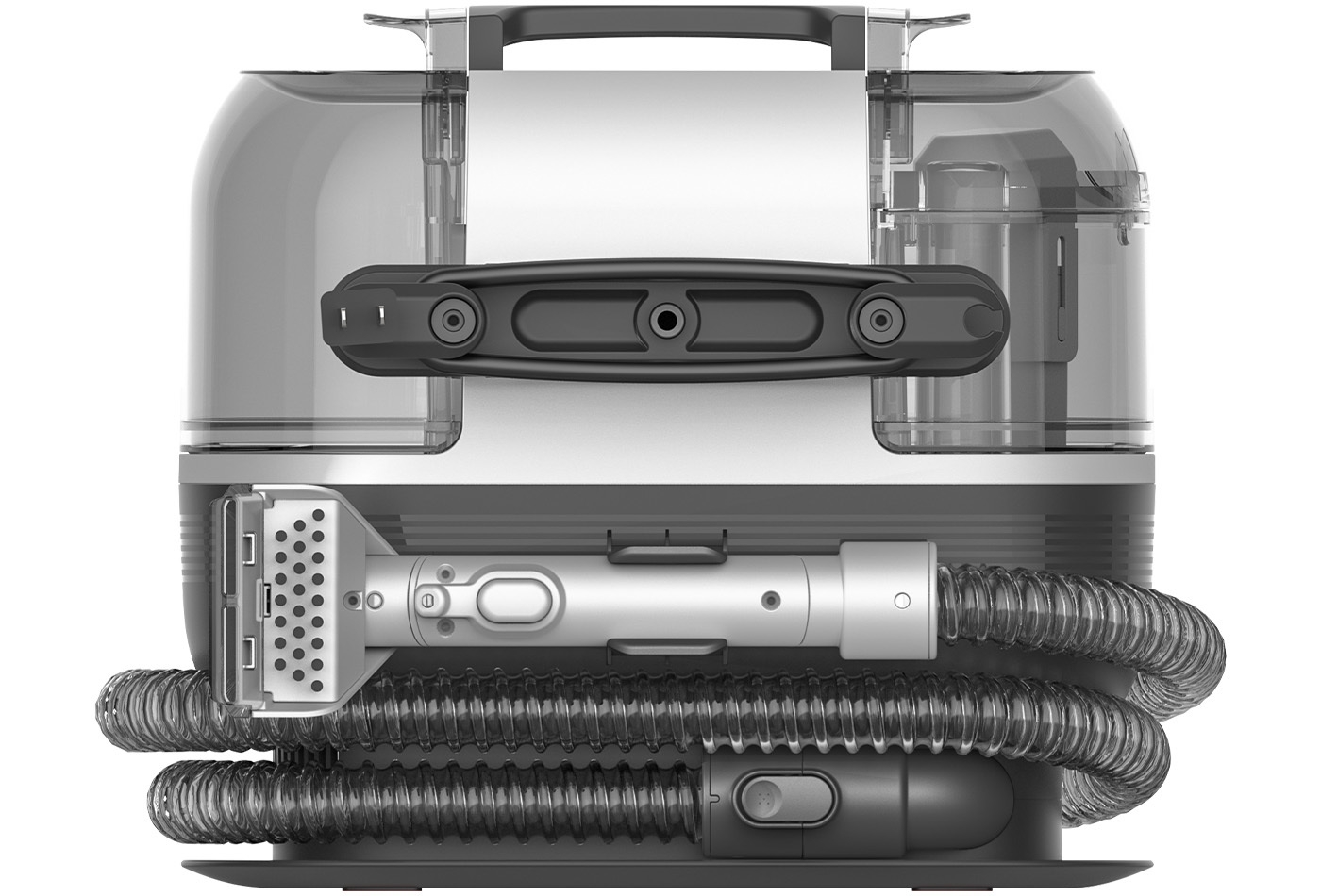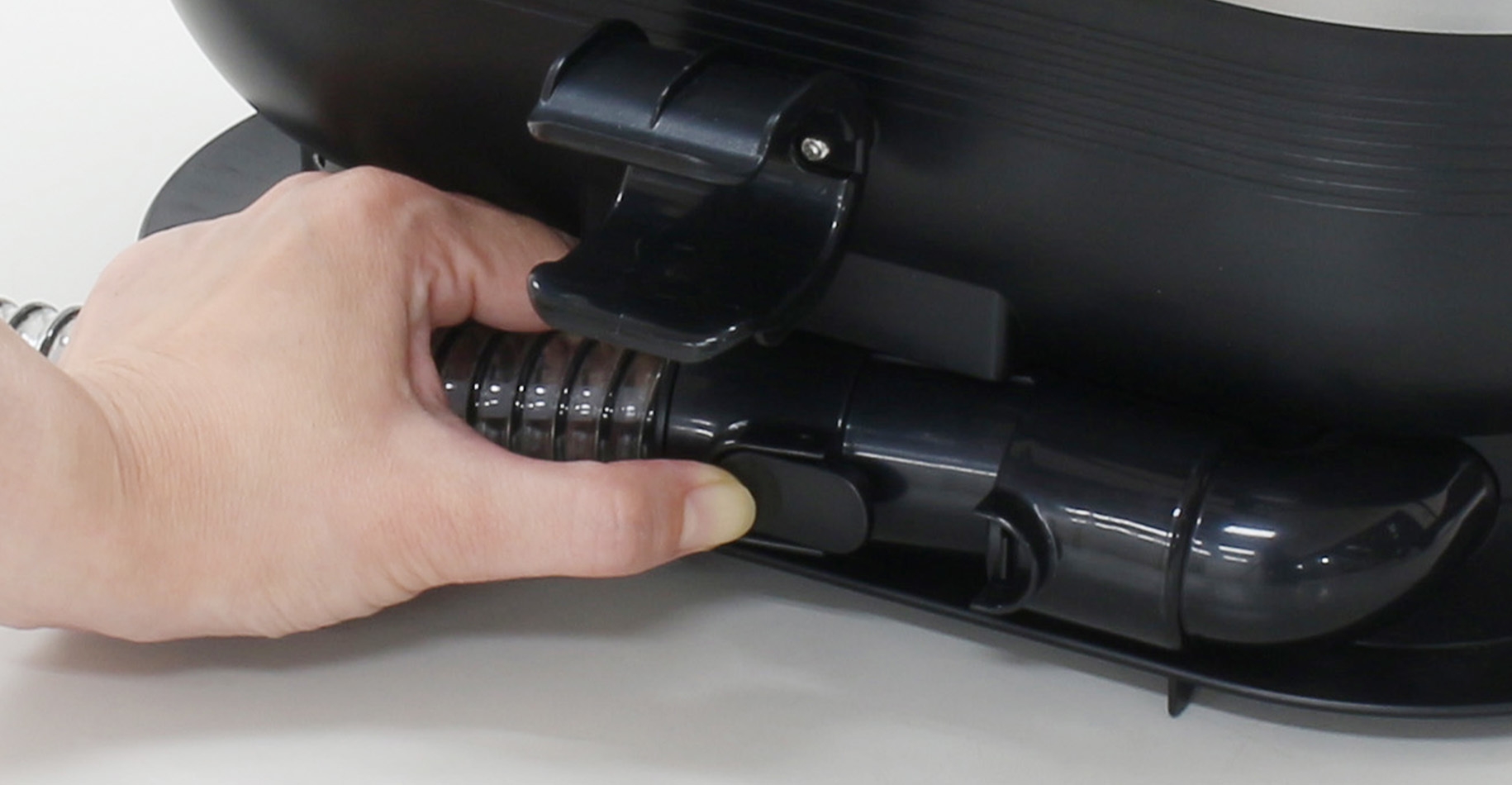 電源コードは本体背面にあるコードフックへ巻きつけて収納することができます。サクションホースは本体下部の溝に巻きつけることでコンパクトに収納することができます。持ち手部分もホース固定フックに簡単にはめ込むことができます。