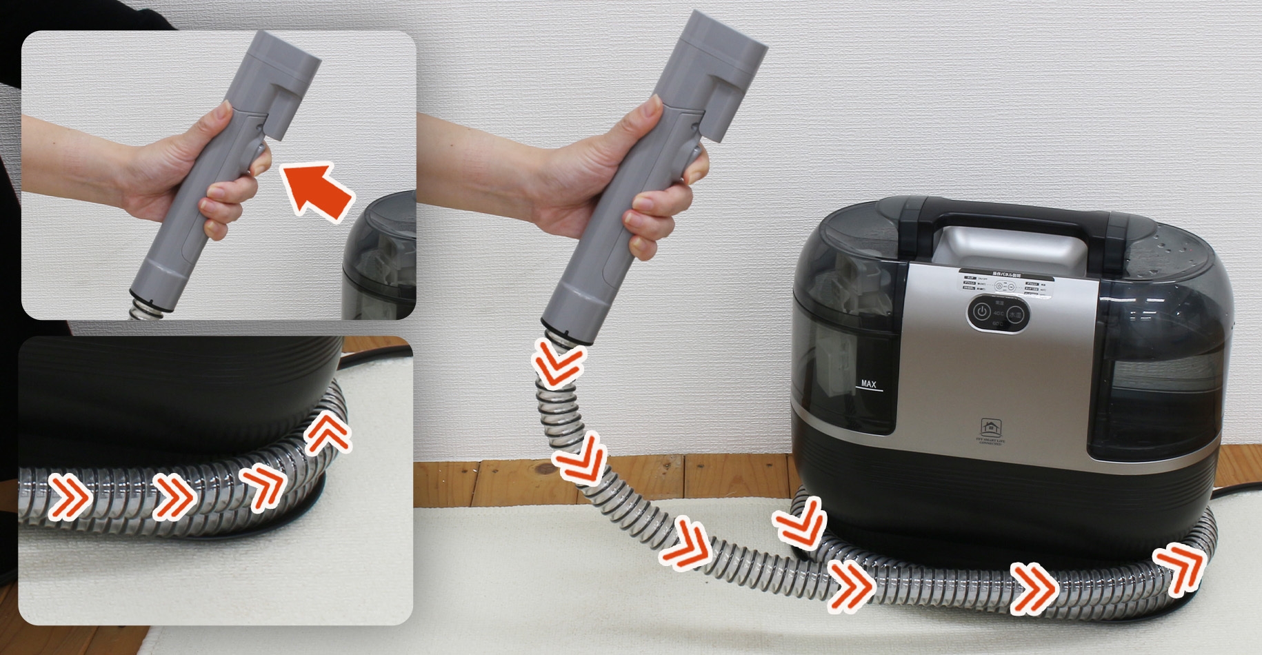 最大加熱約60℃のヒーターを搭載したお湯の力で布製品の しつこい汚れを落とす加熱式カーペットクリーナーを8/22より発売