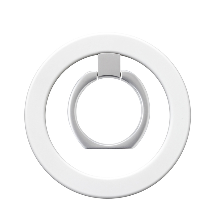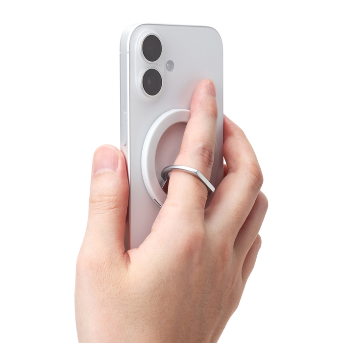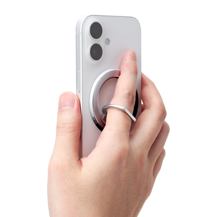本商品は、MagSafe機能をもつスマートフォンに、強力な磁力でピタッとくっついてスマホを持ちやすくするリングホルダーです。
