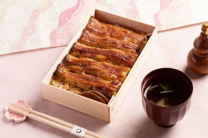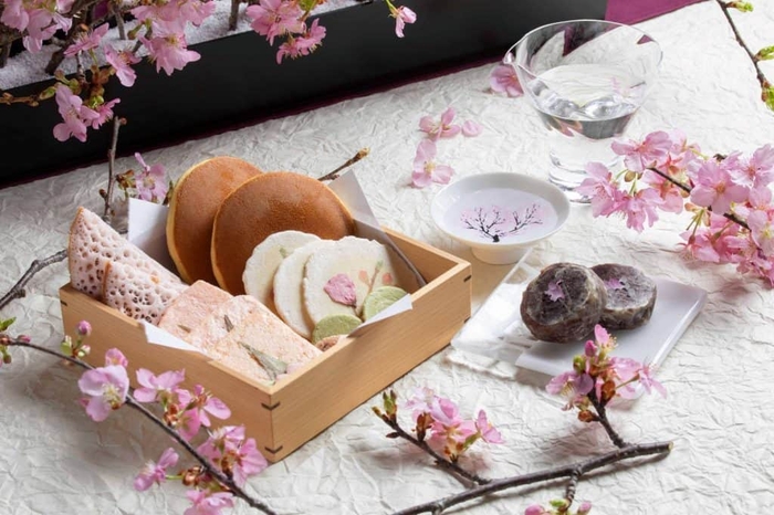 江戸時代には、お花見の際に弁当を持参する風習が一般的になり、各々が好みの食事を持ち寄ってお花見を楽しんだと言われています。(*2)本プランでは、密にならないプライベートな空間である客室に、老舗鰻店「日本橋 いづもや」の協力のもと、夕食にはお店から出前で届くうな重を花見弁当として用意します。また、お酒はお花見をしながら楽しめるよう、微発泡でフレッシュな味わいの「飯沼本家 甲子春酒香んばし」です。日本酒を注ぐと盃の底に満開の桜が浮かび上がる酒器で楽しめます。また、お茶の間ラウンジには、「いいだばし萬年堂」の桜餅や「榮太樓總本鋪」の桜の花びらがのった金鍔(きんつば)など、桜にちなんだ季節のお茶菓子を用意します。