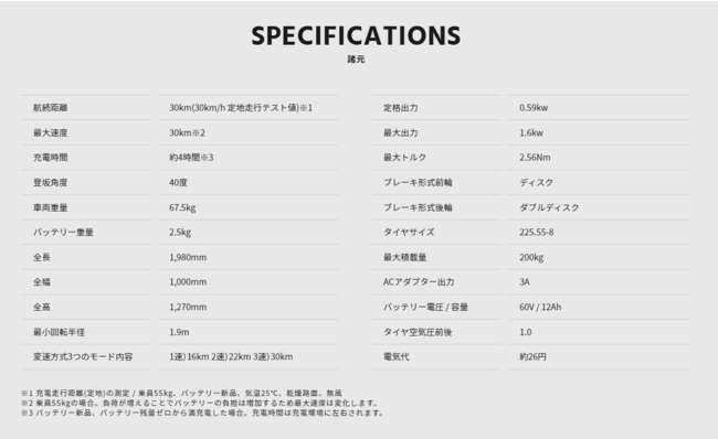 オプションの大容量バッテリーを使えば、約60kmの走行が可能で、その際の充電に掛かる電気代は約65円です!