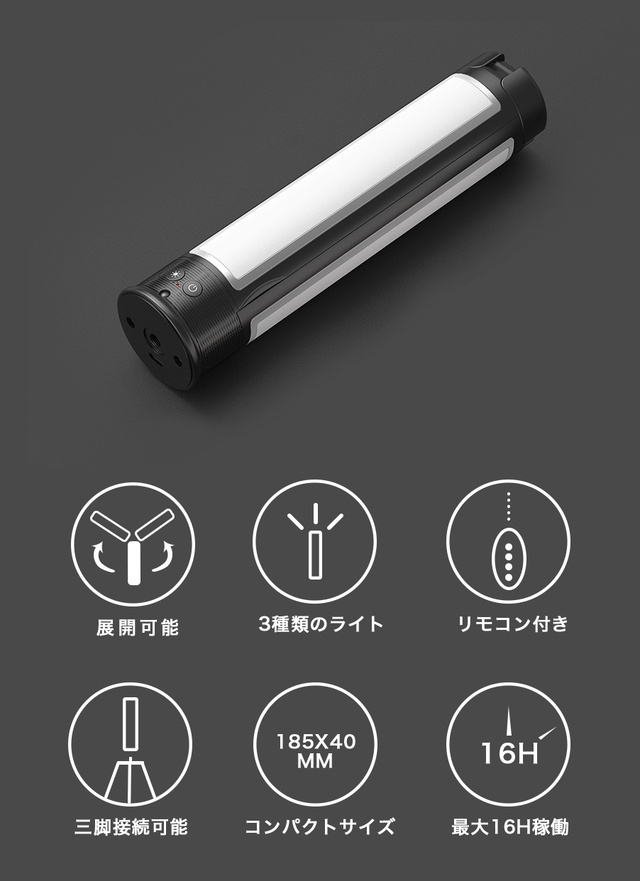 照明の色温度・5段階で変更できる明るさ・点灯面の切り替え・SOSモード搭載。