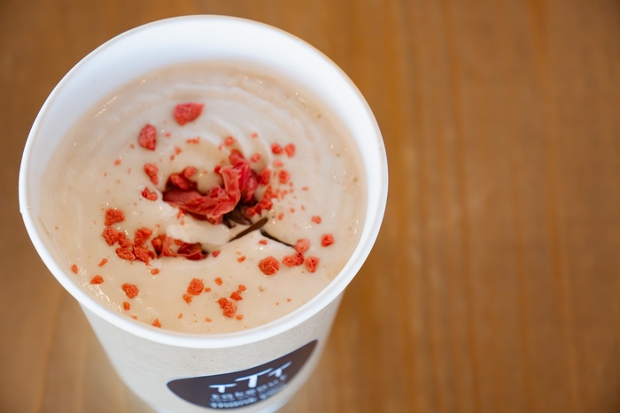 また、「SAKURA茶」は昆布茶ベースで春の香りと伝統の味わいが楽しめます。桜風味のクラッシュゼリーがアクセントとなり、あられの食感が楽しい一杯です。