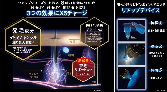 この度新発売となる「リアップX5チャージ」は、国内最大濃度※3の発毛成分「5%ミノキシジル」に加えて、抜け毛予防サポート成分6種類と、育毛サポート成分1種類を配合しました。抜け毛予防サポート成分には「ヒノキチオール」「グリチルレチン酸」「l-メントール」「ジフェンヒドラミン塩酸塩」「ピリドキシン塩酸塩」「トコフェロール酢酸エステル」を、また、今回新たに育毛サポート成分として「パンテノール」を配合しました。さらに、他のリアップシリーズにも採用されている、狙った頭皮にピンポイントで薬液を塗る当社の独自容器“リアップデバイス”も採用しています。