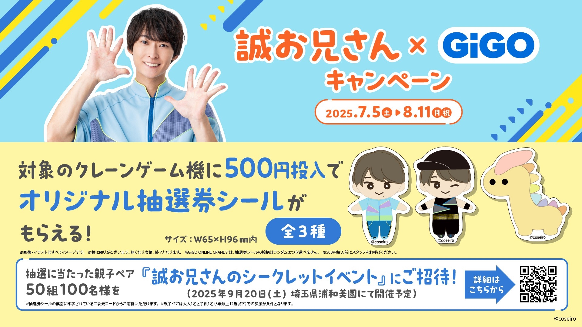 ・GiGOキャンペーン期間中、対象のクレーンゲームへ500円投入で、オリジナル抽選券シール(全3種)を1枚進呈いたします。こちらのオリジナル抽選券シール裏面の二次元コードからご応募いただけます。