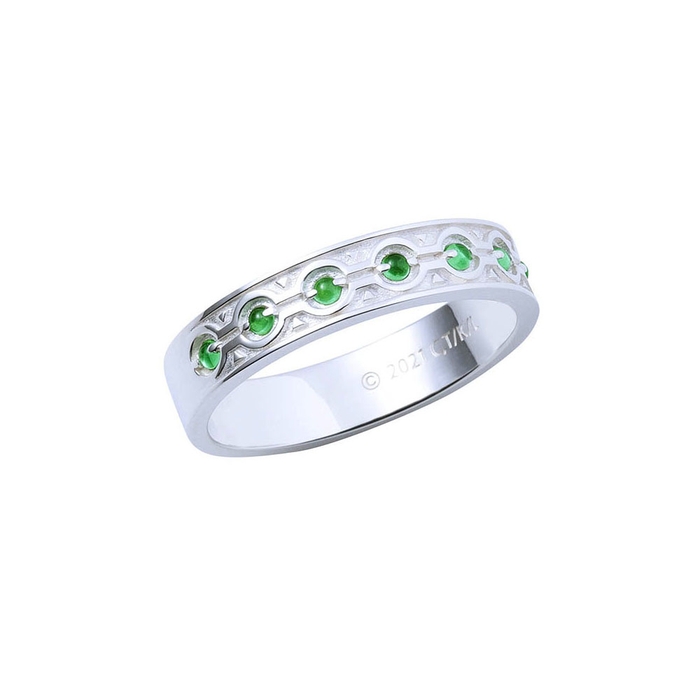 幅の太い平打ちリングに模様を取り込み、グリーンの石を留め表現しています。