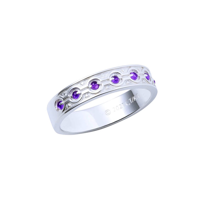 幅の太い平打ちリングに模様を取り込み、パープルの石を留め表現しています。