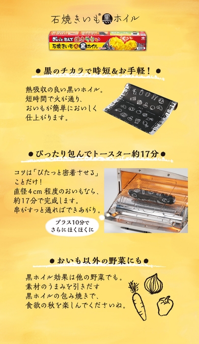 当社では、さつまいもを包んでオーブントースターで焼くだけで、焼きいもが⼿軽に作れるアルミホイル『⽯焼きいも®黒ホイル』を販売してまいりました。