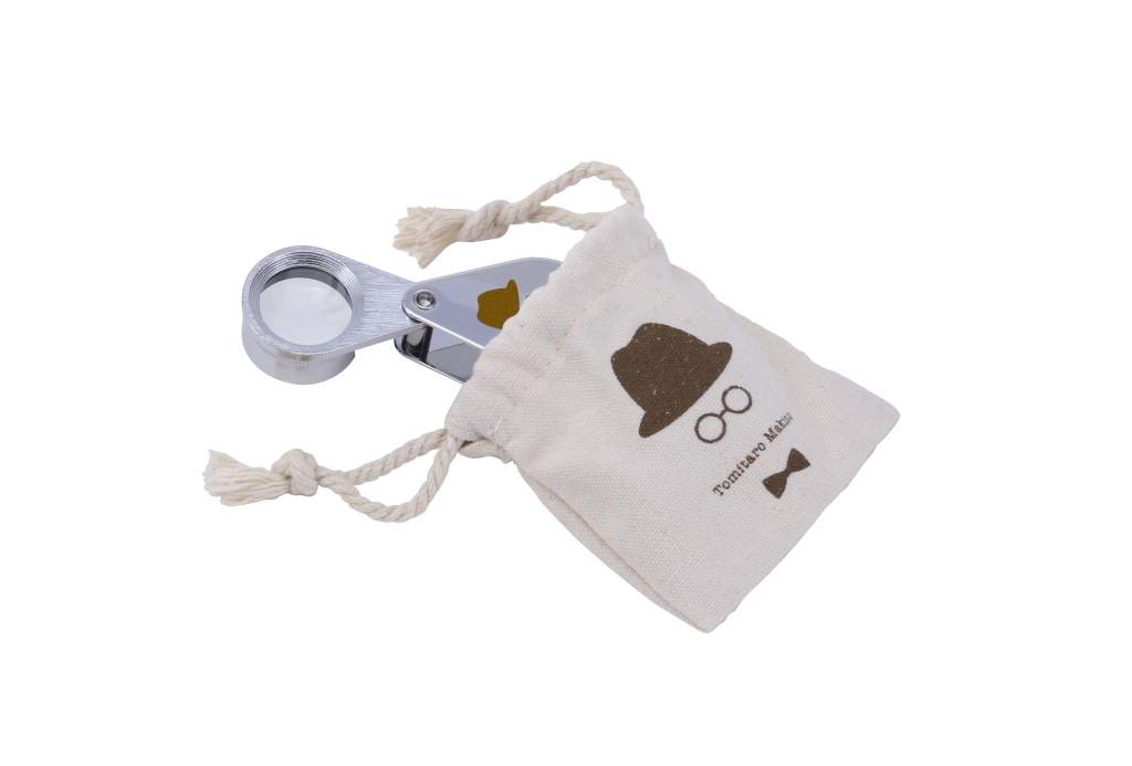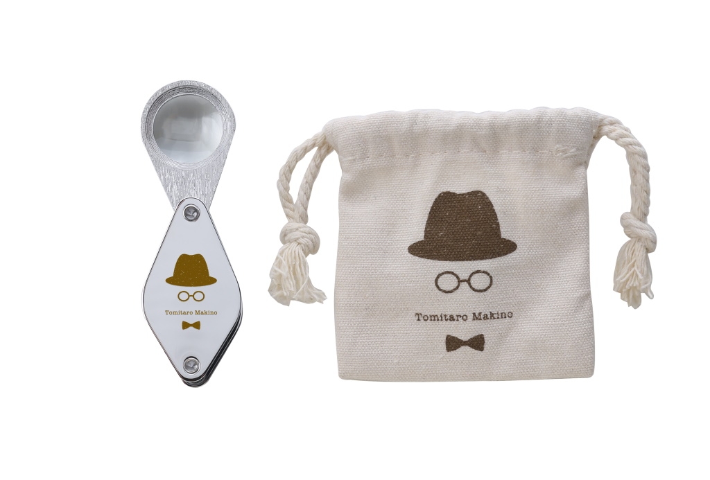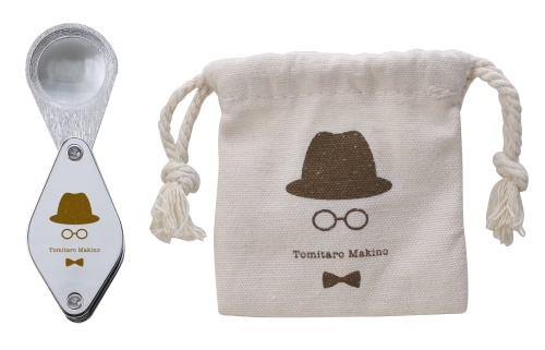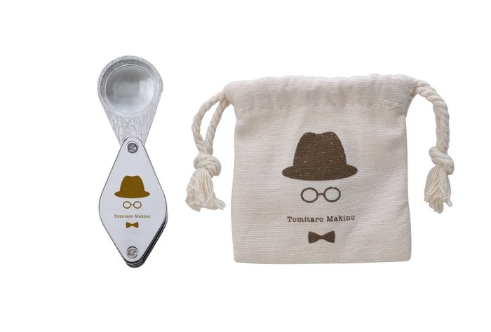 植物の細部までしっかり観察できる10倍のルーペです。高倍率で拡大するからこそ見ることのできる植物の細かな作りも楽しめます。持ち運びに便利な巾着型の付属収納ケースには、牧野富太郎博士のトレードマークでもある帽子と眼鏡、蝶ネクタイがデザインされています。