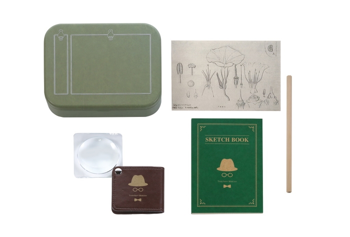 植物をこよなく愛した植物学者の牧野富太郎博士が、植物採集・観察の際に愛用していたアイテムをイメージしたセットです。牧野式胴乱をモチーフにした缶ケースの中に、植物観察用のポケットルーペ、耐水紙のスケッチブック、スケッチに適した2Bえんぴつ、牧野植物園監修の植物図カードがセットされています。