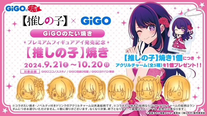 全国3か所のGiGOグループのお店でアクリルチャーム(全5種)がランダムで1個付いてくる「【推しの子】焼き」を販売いたします。