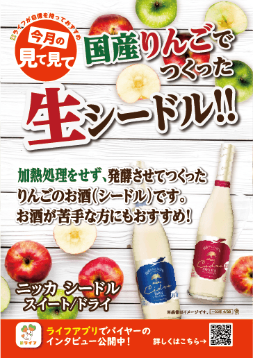 “おいしい” “ワクワク” “ハッピー” をお届けするライフコーポレーションは、お客様からのご要望にお応えして、フルーティーで飲みやすいと人気の「ニッカ シードル(スイート・ドライ)」の飲みきりサイズ”500ml”を新発売いたしました。