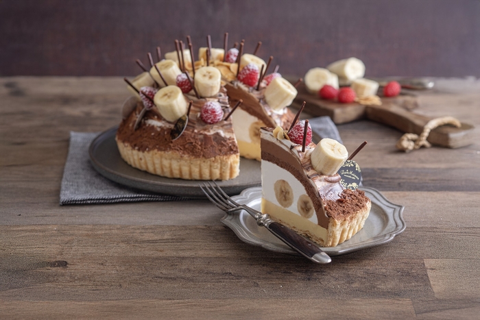 クリームチーズタルトにバナナをのせ、ホイップクリームとチョコクリームで包み込みました。甘酸っぱいラズベリーと香ばしいアーモンドを飾り、バナナとチョコレートの相性がばっちりのタルトです。
