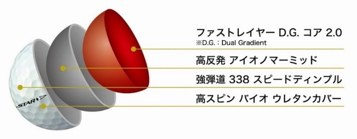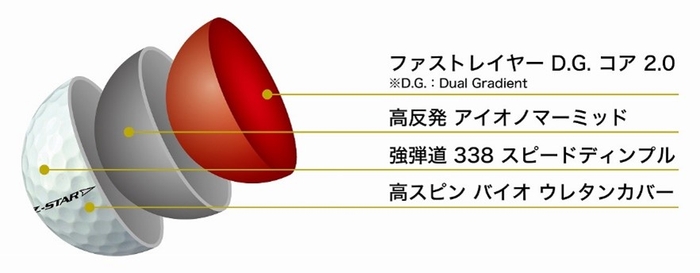 カバーを薄く設計し、ボールの反発性能を左右するコア・ミッドの直径をその分大きくすることにより、初速をアップさせると同時にドライバーのスピン量を抑え、高い飛距離性能を実現します。また、コアには従来モデルに引き続き「ファストレイヤー D.G. ※3 コア 2.0」を採用。高初速化を維持しつつ、ドライバーショットで低スピン化を実現し、高い飛距離性能をサポートします。