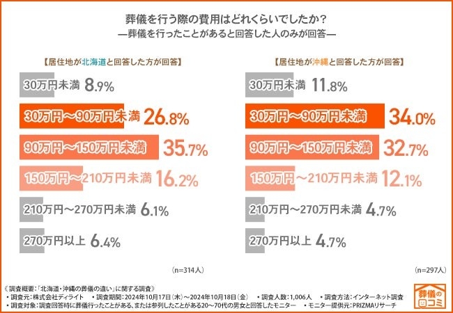 「葬儀を行う際の費用はどれくらいでしたか?」と質問したところ、北海道地方と沖縄地方で以下のような回答になりました。
