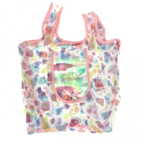 見てください、この透け感。最強に可愛くないですか!?もうこれはエコバッグというより普通にメインバッグとして使いたいレベル。透け感があるから中身もオシャレに決めてあえて見せるスタイルで出かけたい!スナップ部分のオーロラカラーがさらにオシャレ度を上げています。
