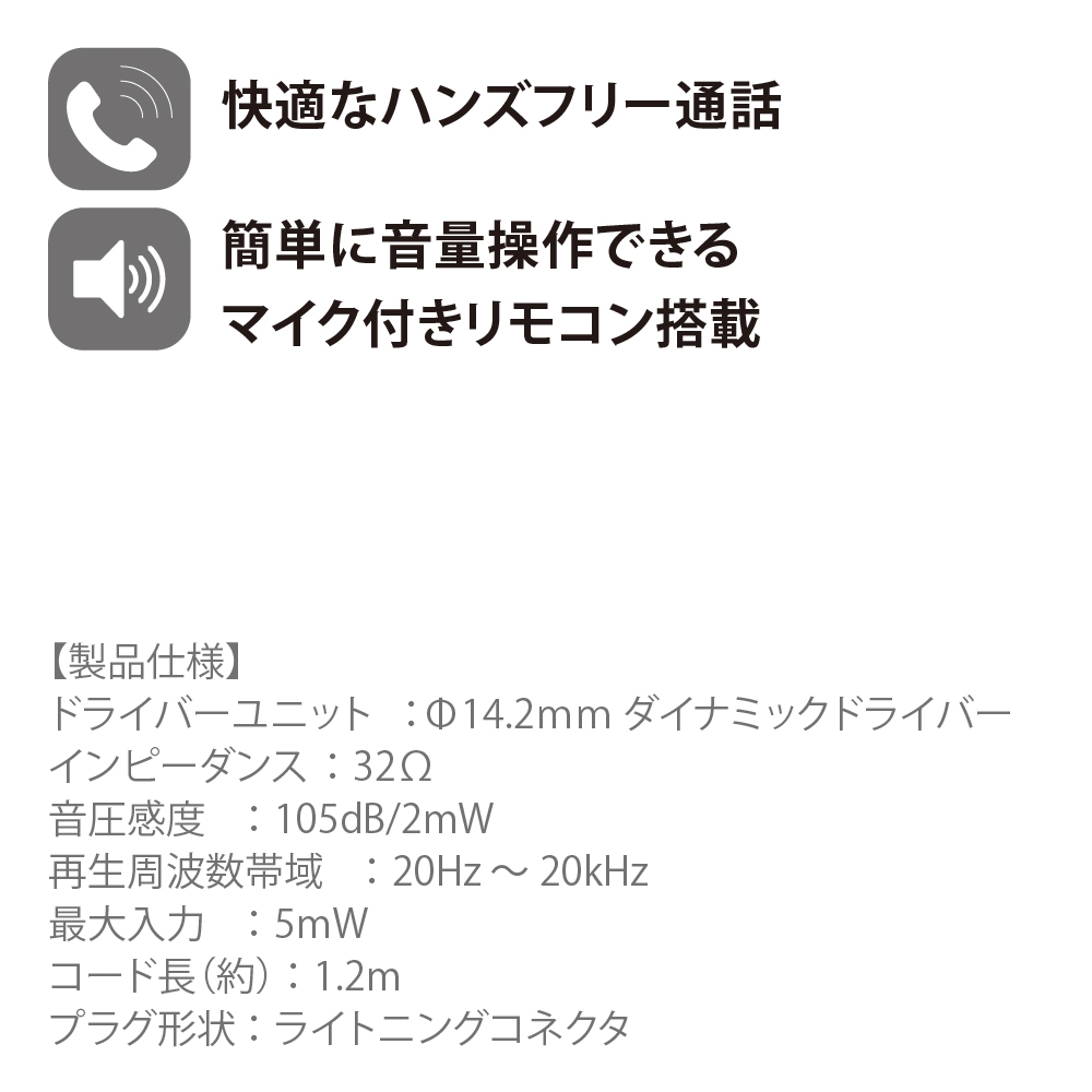 iPhoneやiPadのLightningコネクタに直接接続して快適に音楽や通話を楽しめるLightningコネクタ ステレオイヤホンです。イヤホン部はインナーイヤー型を採用し、簡単に着脱でき、密着する違和感や長時間での疲労感を感じにくいのが特長です。また、大口径φ14.2mmダイナミックドライバーを採用し、低域から高域までバランスの良い高音質を再生でき、音の臨場感と空間を感じることが出来ます。ハンズフリー通話や快適に手元で操作できる多機能リモコンを搭載。Apple認定 MFi認証取得製品なのでiOSアップデート後も安心・安全にご使用頂けます。