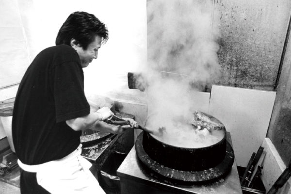 スープに使用するのは豚の頭と背脂だけ。昔ながらの鉄の大釜で、豚頭を焦がさないようつきっきりで24時間、ひたすら煮詰めます。徹底的に煮詰めるため、ひと釜で仕上がるスープは多くても50杯分です。