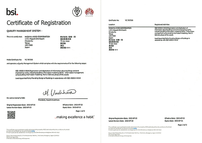 安藤ハザマ(本社:東京都港区、社長:福富 正人)は、7月22日にBSIグループジャパン(英国規格協会)からISO 19650-1およびISO 19650-2(注1)に基づく「設計と建設のためのBIM BSI Verification(検証)」の認証を取得しました。