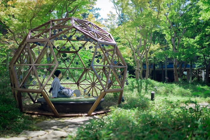 阿蘇くじゅう国立公園に佇む温泉旅館「界 阿蘇」では、テラスに特製のやぐらを組み、熊本県の伝統工芸「天草磁器」の風鈴を設えます。爽やかな風が吹き抜けるテラスで森との一体感を感じながら、湯上がりのひとときを過ごせます。