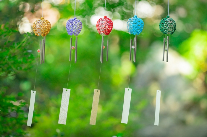 石川県の伝統工芸「加賀水引」の風鈴。水引ならではの軽やかな見た目と金属製のパイプ特有の澄んだ音色が涼やかさを演出します。