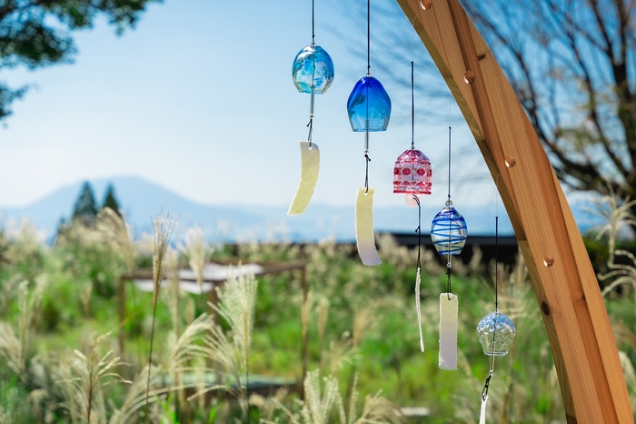 桜島を見渡す壮大な自然に包まれた温泉旅館「界 霧島」では、すすき野原の絶景を望む湯浴み小屋のテラスで、すすきに見立てたオブジェに鹿児島県の伝統工芸「薩摩切子」と「薩摩ビードロ」の風鈴を設えます。自然豊かな景色を眺めながら、湯上がりのひとときを過ごせます。
