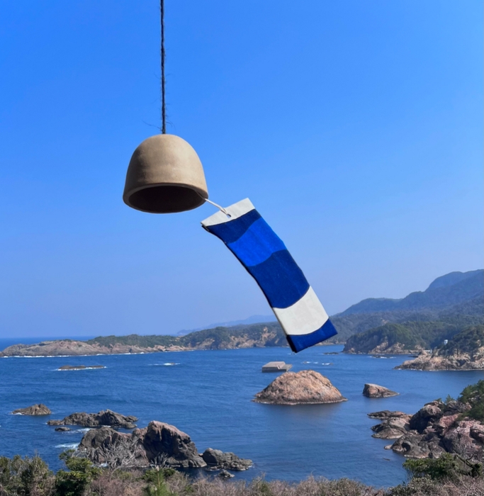 硬質な瓦の高い音が特徴の「石州瓦」と島根県の伝統工芸「筒描藍染」の手法を使ったオリジナルの風鈴。