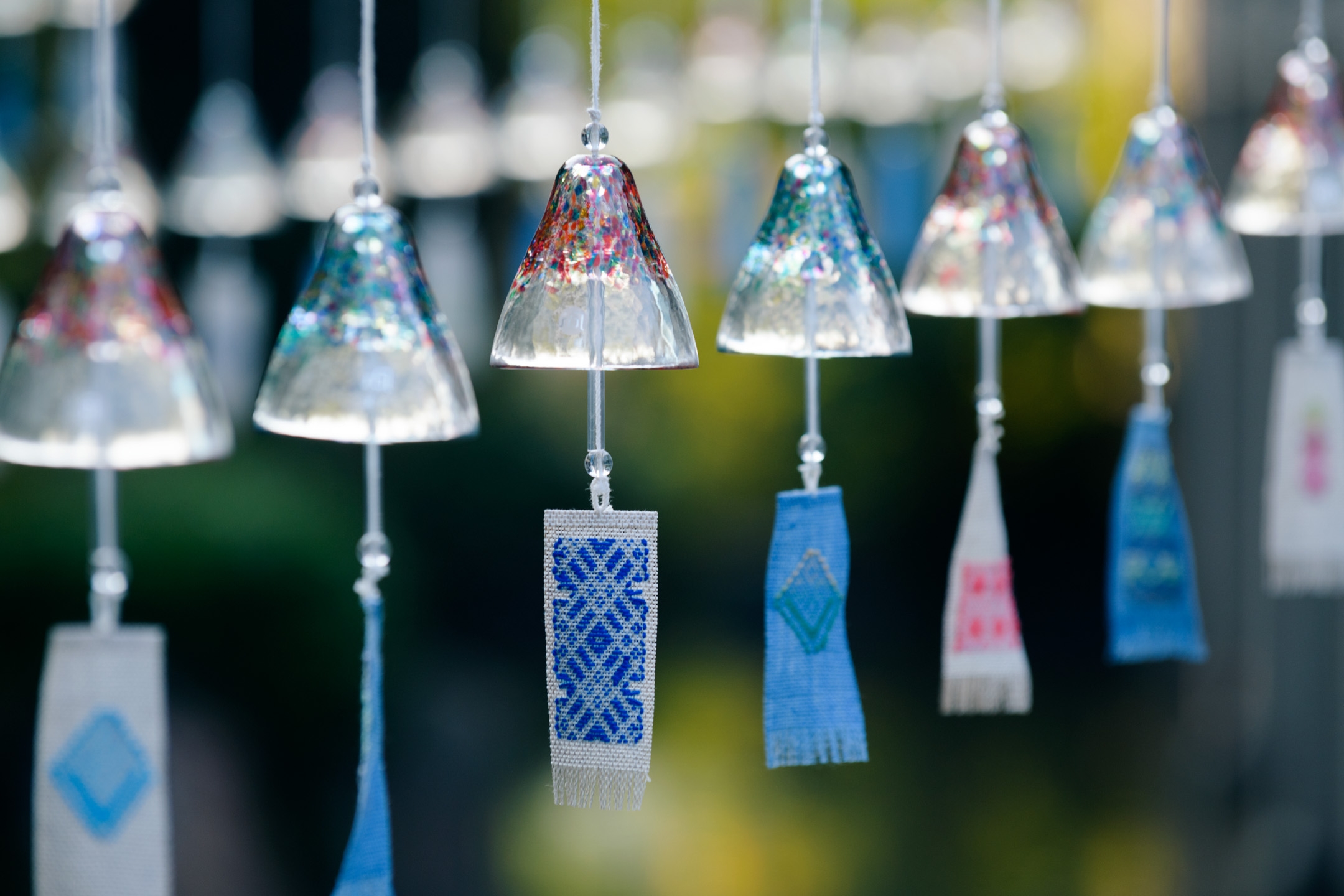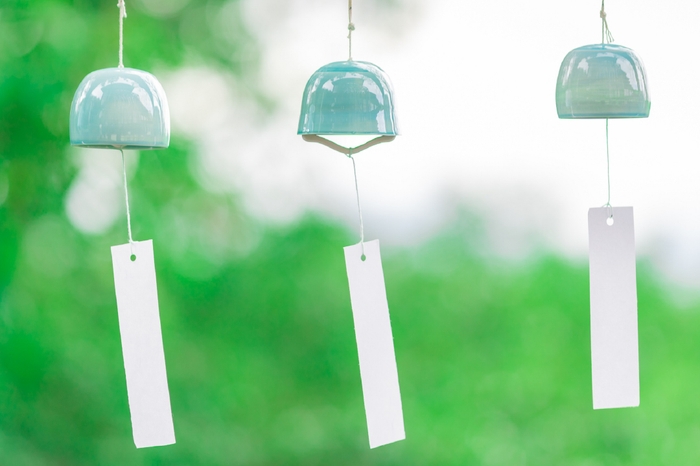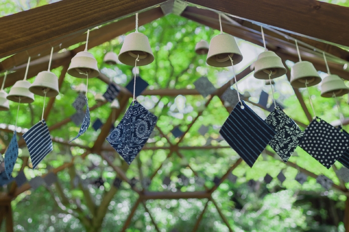 館内や客室にも使われている静岡県浜松市の伝統工芸「遠州綿紬」を短冊に使用した風鈴。涼しげな色味のものを集めました。