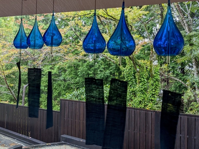 各施設でご当地の素材や伝統工芸を用いたご当地風鈴を設えます。例えば、モダンなとちぎ民藝が息づく、木漏れ日の温泉旅館「界 鬼怒川」のご当地風鈴は、栃木県の伝統工芸「益子焼」と「黒羽藍染」を組み合わせたオリジナルの風鈴です。約100個のご当地風鈴がそよ風に吹かれると、陶器ならではの素朴な音がオーケストラのように響きあうことで、湯上がりにいっそうの涼を感じられます。