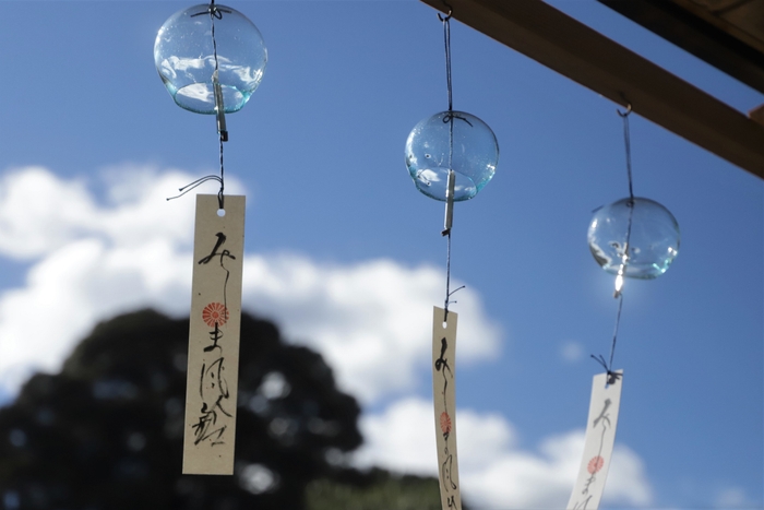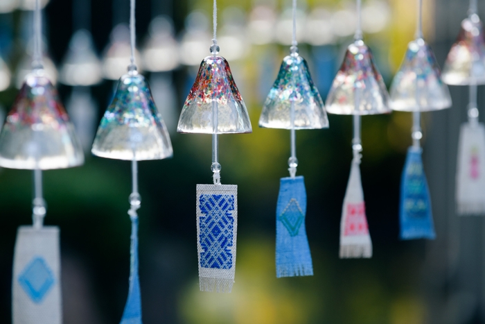 小田原にアトリエを構える「ipada glass」の職人が手掛ける青色のガラス風鈴。1つ1つ異なる音、色、形が魅力的な世界観を演出します。