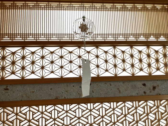 客室にも使われている長野県大町市の伝統工芸「松崎和紙」の風鈴。天然の葉や花を漉き込んだ、温かみのある風合いが特徴です。