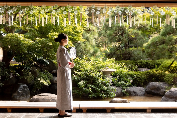 石川・山代温泉の温泉旅館「界 加賀」では、館内の茶庭テラスに、石川県の伝統工芸「加賀水引」の風鈴を設えます。苔むす日本庭園を望みながら、湯上がりのひとときを過ごせます。