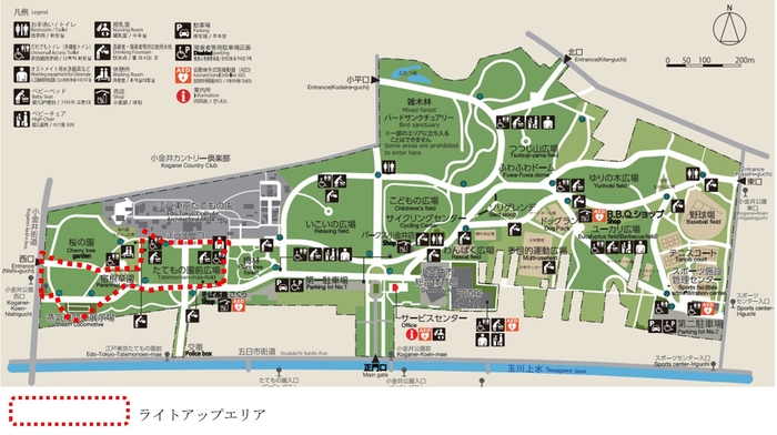 玉川上水沿いに位置した、面積約80ヘクタール(日比谷公園の5倍、上野恩賜公園の1.5倍)の広大な公園です。この公園は広々とした草地、それを取り巻く雑木林、桜の園、わんぱく山、弓道場、SL(C57)展示、16面のテニスコートと内容豊かな公園です。この公園の前身は、昭和15年の紀元2600年記念事業で計画された小金井大緑地です。戦後、東宮仮御所に使用され、また農地解放により4割を失いましたが、29年に都市公園として開園されました。