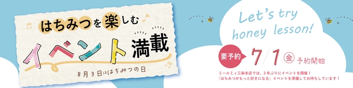 株式会社金市商店(本社:京都市中京区三条通富小路西入中之町 21)は、8月3日の「はちみつの日」を 記念して、「蜂蜜専門店ミールミィ」などの直営店舗にて様々なイベントを企画、開催いたします。
