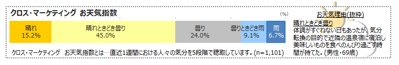クロス・マーケティングお天気指数とは、直近1週間における人々の気分をお天気で表したものです。お天気の理由も一部抜粋してお知らせします。